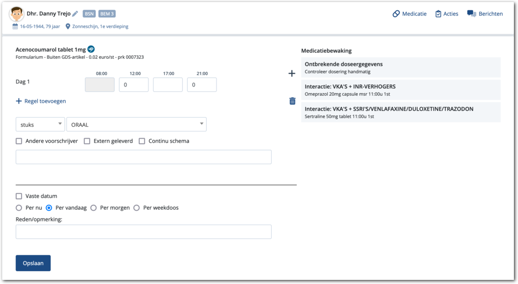 medicatie moet gebruiken en het moment waarop Medimo de medicatie stopt.