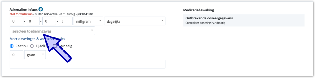 vanuit de G-standaard, toont Medimo in het lichtgrijs 'selecteer toedieningsweg'.