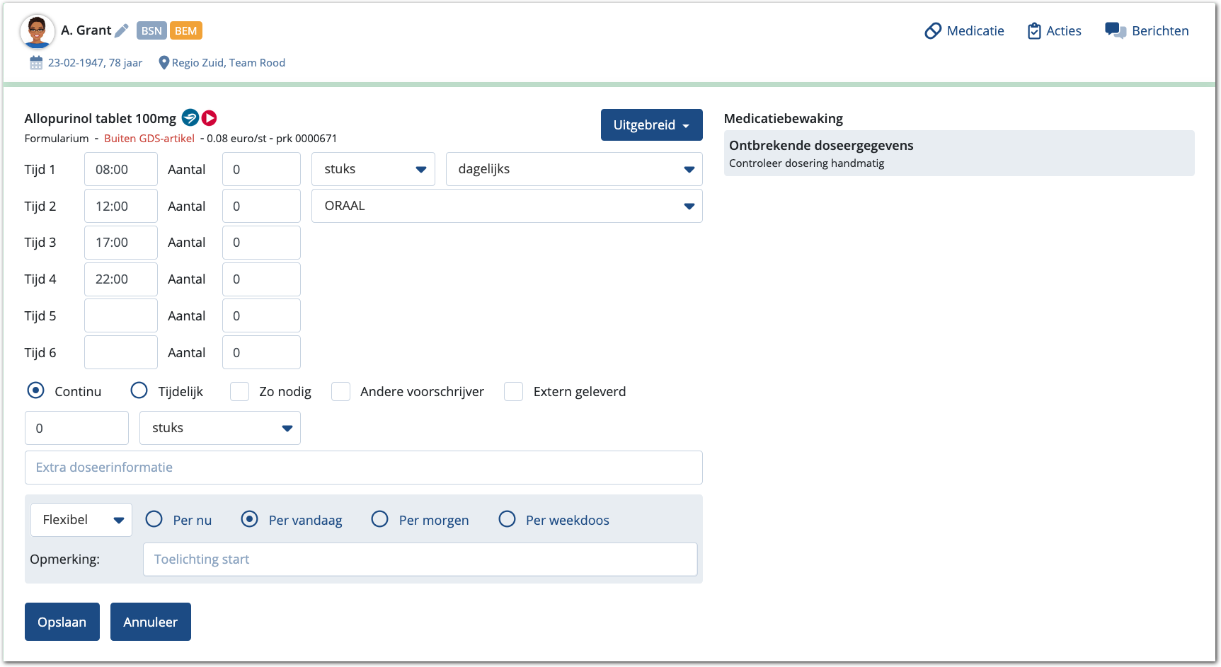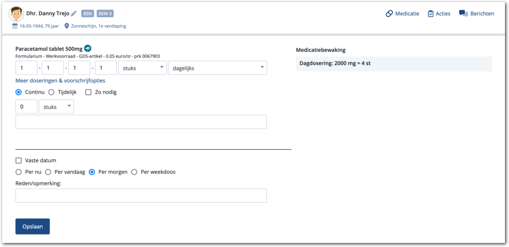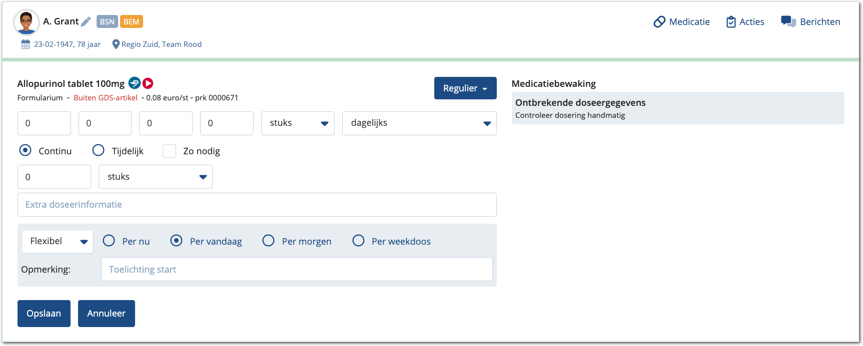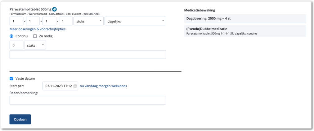 Standaard wordt de dosering uit het formularium vooringevuld. Deze kunt u
