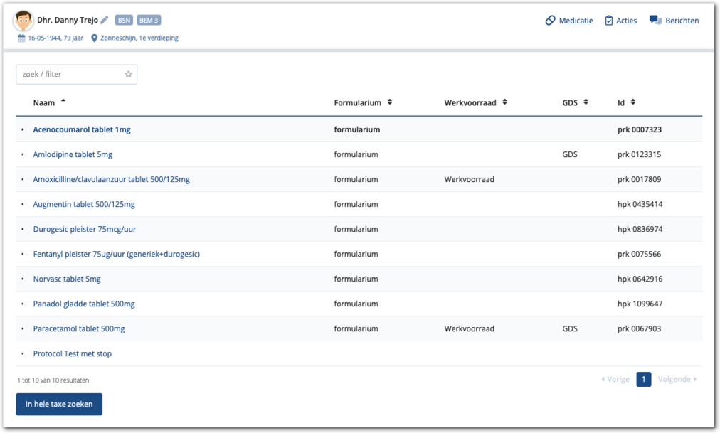 - Zoek het geneesmiddel. Gebruik hiervoor het veld Zoek / Filter. Standaard zoekt u in het formularium. Kunt u het geneesmiddel niet vinden? Gebruik dan de knop In hele taxe zoeken.