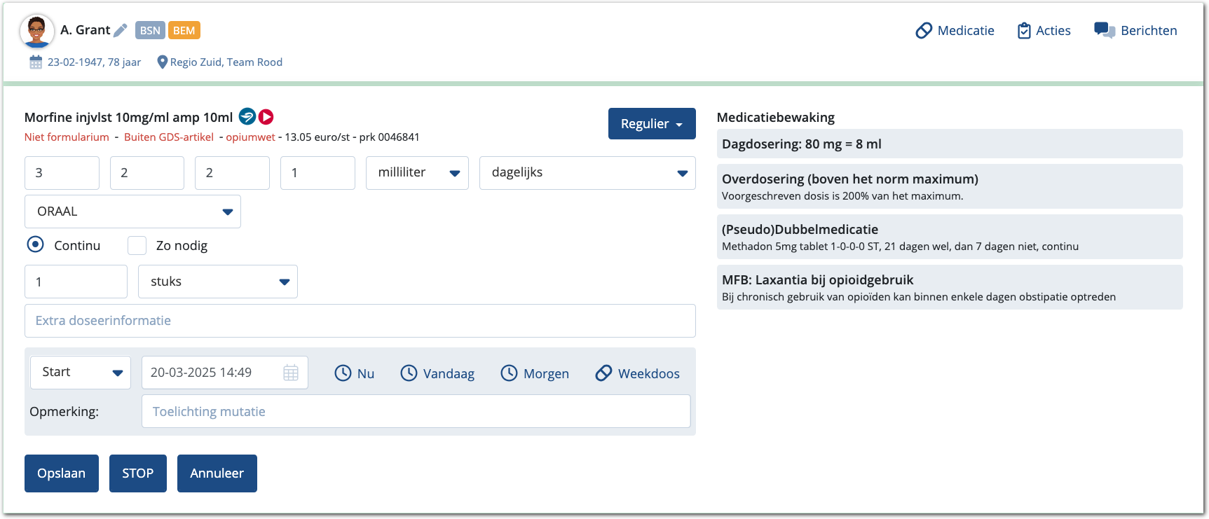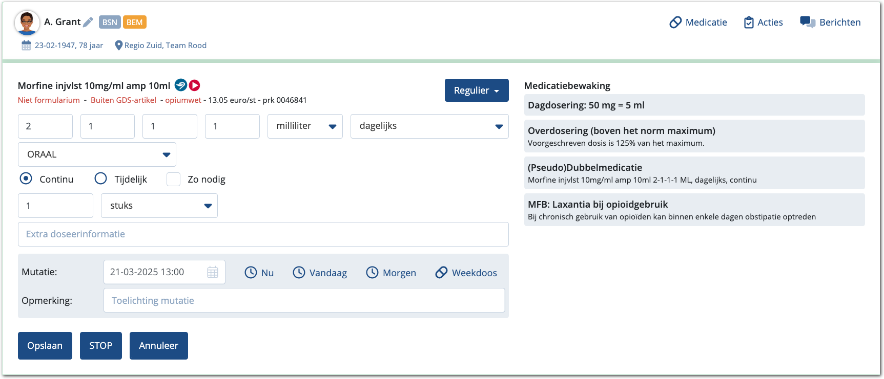 Als u wilt voorstellen om de medicatie te stoppen, gebruikt u de knop STOP. Hiermee worden de velden om de dosering in te voeren inactief en hoeft u alleen de stop op te geven.