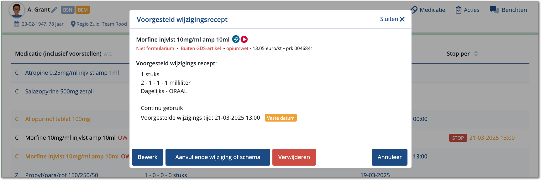 Indien nodig kunt u het medicatievoorstel annuleren. Open daarvoor het medicatievoorstel en kies Verwijderen. Hierna wordt gevraagd het verwijderen te bevestigen. Nadat u dit hebt bevestigd, verwijderd u het medicatievoorstel en wordt de pagina medicatie inclusief medicatievoorstellen getoond.