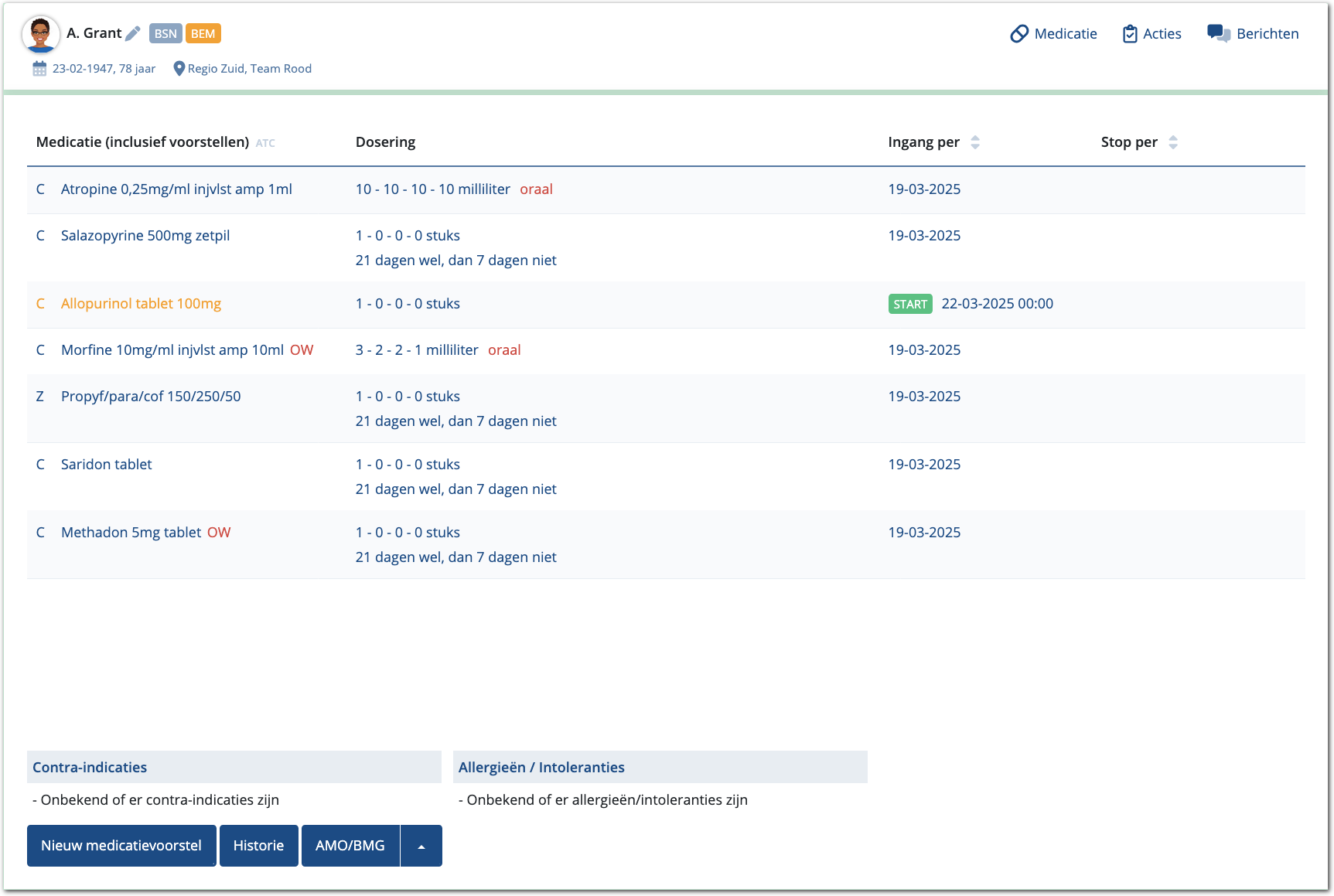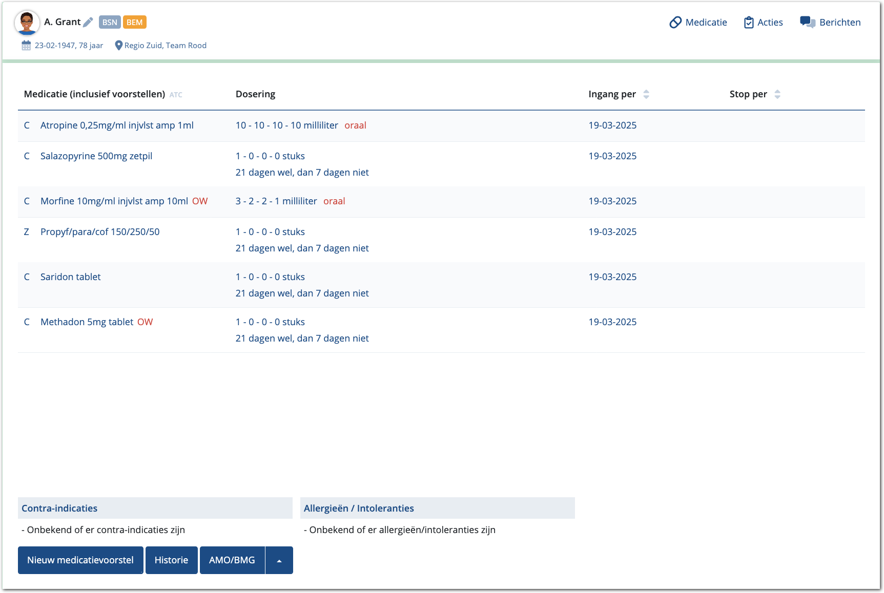 De laatste stap is uw invoer op te slaan. Klik daarvoor op Opslaan. Hierna wordt de pagina met medicatie inclusief medicatievoorstellen getoond.