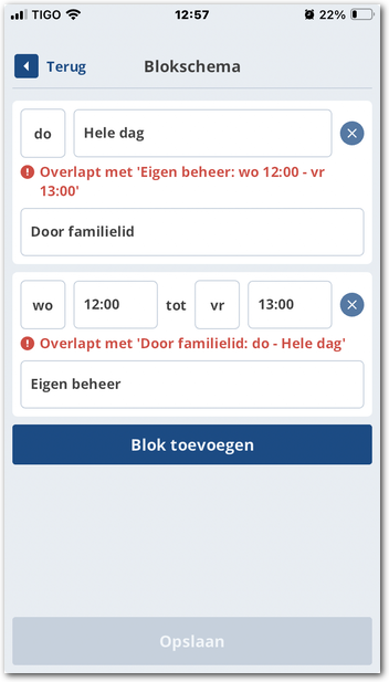 Een toediening kan maximaal één registratie hebben. Medicatie kan immers niet in eigen beheer zijn en tegelijkertijd door een familielid zijn gegeven. Voor een blokschema dat bestaat uit meerdere blokken geldt daarom dat de blokperiodes elkaar niet mogen overlappen. Overlappen de periodes wel, dan wordt het opslaan geblokkeerd en wordt de overlapping in het rood weergegeven. De bovenstaande rechterafbeelding is hiervan een voorbeeld.