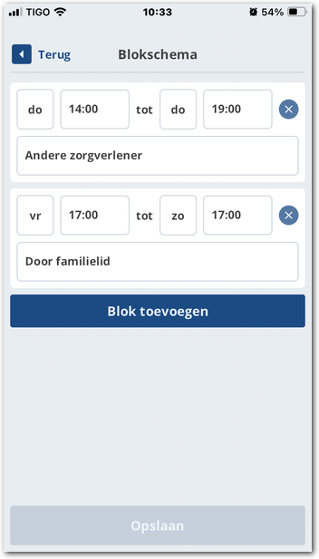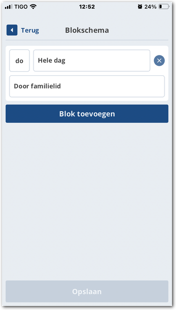 Gaat de cliënt bijvoorbeeld naar een dagbesteding en is er nog geen blokschema ingesteld, dan kunt u een nieuwe toevoegen. Volg daarvoor de onderstaande instructies:
