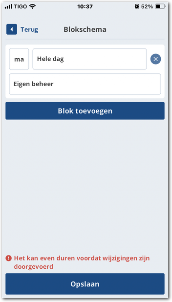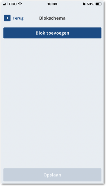 Hiervoor kunt u nieuwe blokken toevoegen en bestaande blokken aanpassen of verwijderen. Een blok verwijderen kan met het kruisje dat aan de rechterzijde in het blok wordt weergegeven. Nadat u het blokschema hebt gewijzigd, wordt de knop 'Opslaan' actief en kleurt donkerblauw. De onderstaande afbeelding is hiervan een voorbeeld.