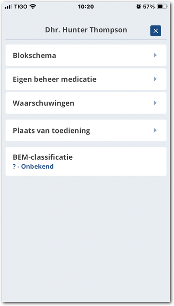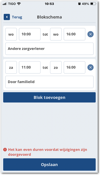 Wanneer u een nieuw blokschema toevoegt of een bestaand blokschema aanpast, dan geldt dit (nieuwe) schema voor medicatie die nog niet is afgetekend. Het kan daarom even duren voordat de wijzigingen in het blokschema worden doorgevoerd op de toedienregistratie. Om u daarop te wijzen, wordt dit in de app in het rood gemeld.