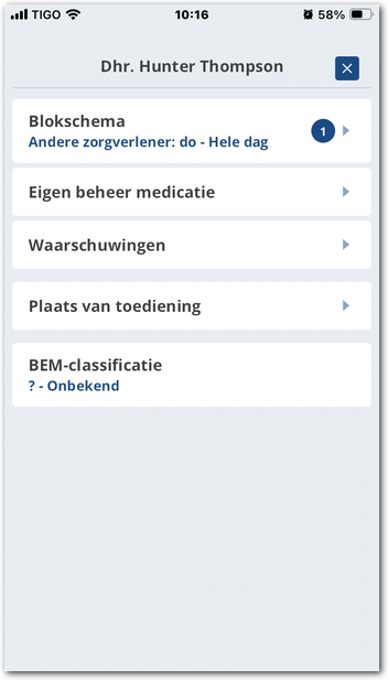 Sinds geruime tijd kunt u het eigen beheer van medicatie vastleggen in Medimo. Hiermee wordt medicatie die de cliënt in eigen beheer heeft, 90 minuten voor het toedienmoment automatisch afgetekend als 'Eigen beheer'. Het blokschema heeft een vergelijkbare functionaliteit. Hierbij vindt niet per middel automatisch een registratie plaats, maar per dag(deel). Ook kunt u gebruik maken van verschillende typen registraties zoals 'Andere zorgverlener' en 'Door familielid'. Hierdoor is een blokschema uitermate geschikt voor bijvoorbeeld cliënten die naar een externe dagbesteding gaan of wekelijks verlof hebben.