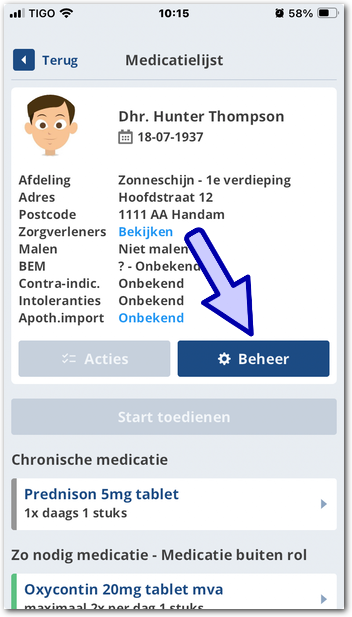 Het blokschema gaat u na via de knop 'Beheer' bij de medicatielijst van de cliënt. De onderstaande afbeelding is een voorbeeld van een medicatielijst. De blauwe pijl wijst naar de betreffende knop.