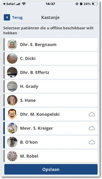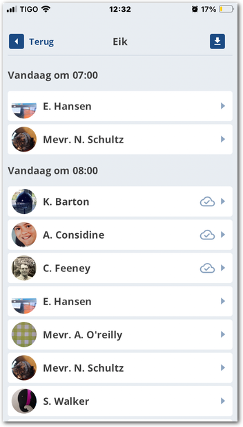 Hiermee bevestigt u de selectie, start de app het downloaden en navigeert u naar de werklijst. Cliënten waarvan de app de medicatielijst heeft gedownload, herkent u in de werklijst aan het wolkje met een vinkje. Dit komt overeen met de onderstaande afbeelding.