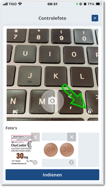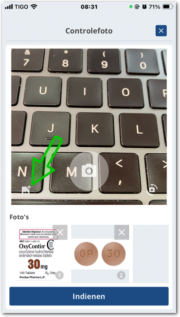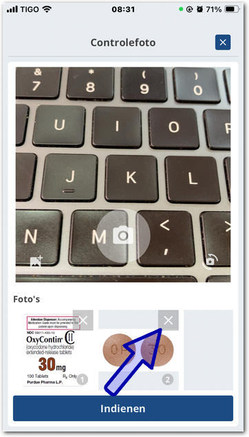 Heeft u een verkeerde foto gemaakt of toegevoegd, dan kunt u deze verwijderen voordat u de controlefoto's aanbied. Gebruik daarvoor het witte kruisje in de foto in de lijst met foto's. In de onderstaande afbeelding wijst de gekleurde pijl daarnaar.