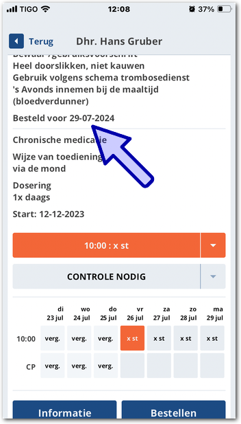 Hiermee plaatst u de bestelling bij de apotheek en wordt de door u opgegeven gewenste leverdatum getoond bij het middel. De onderstaande afbeelding is hiervan een voorbeeld. De blauwe pijl wijst naar de gewenste leverdatum.