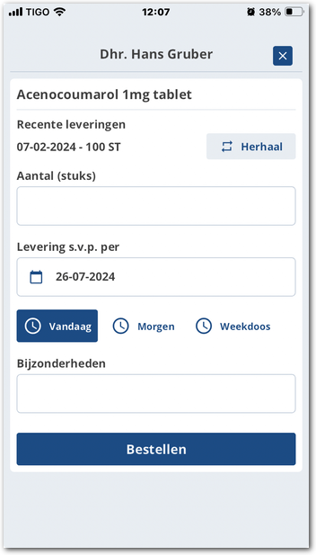 U kunt hiervoor de knoppen 'Vandaag', 'Morgen' of 'Weekdoos' gebruiken. Wilt u hiervan afwijken, dan kunt u tikken in het 'Levering s.v.p. per'-veld om handmatig een datum op te geven. Naast de gewenste leverdatum kunt u optioneel een extra opmerking toevoegen in het veld 'Bijzonderheden'. Deze opmerking wordt verzonden naar de apotheek.
