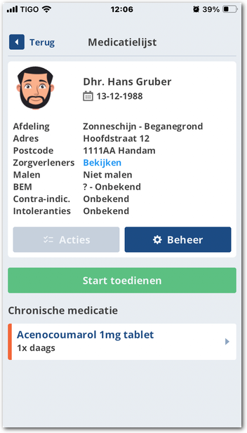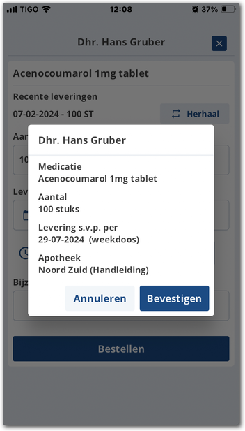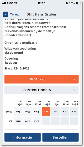 U bestelt medicatie vanuit de medicatielijst van de cliënt. Daar kunt u op het middel dat u wilt bestellen tikken om de details te openen. Dit ziet eruit zoals de onderstaande afbeelding.