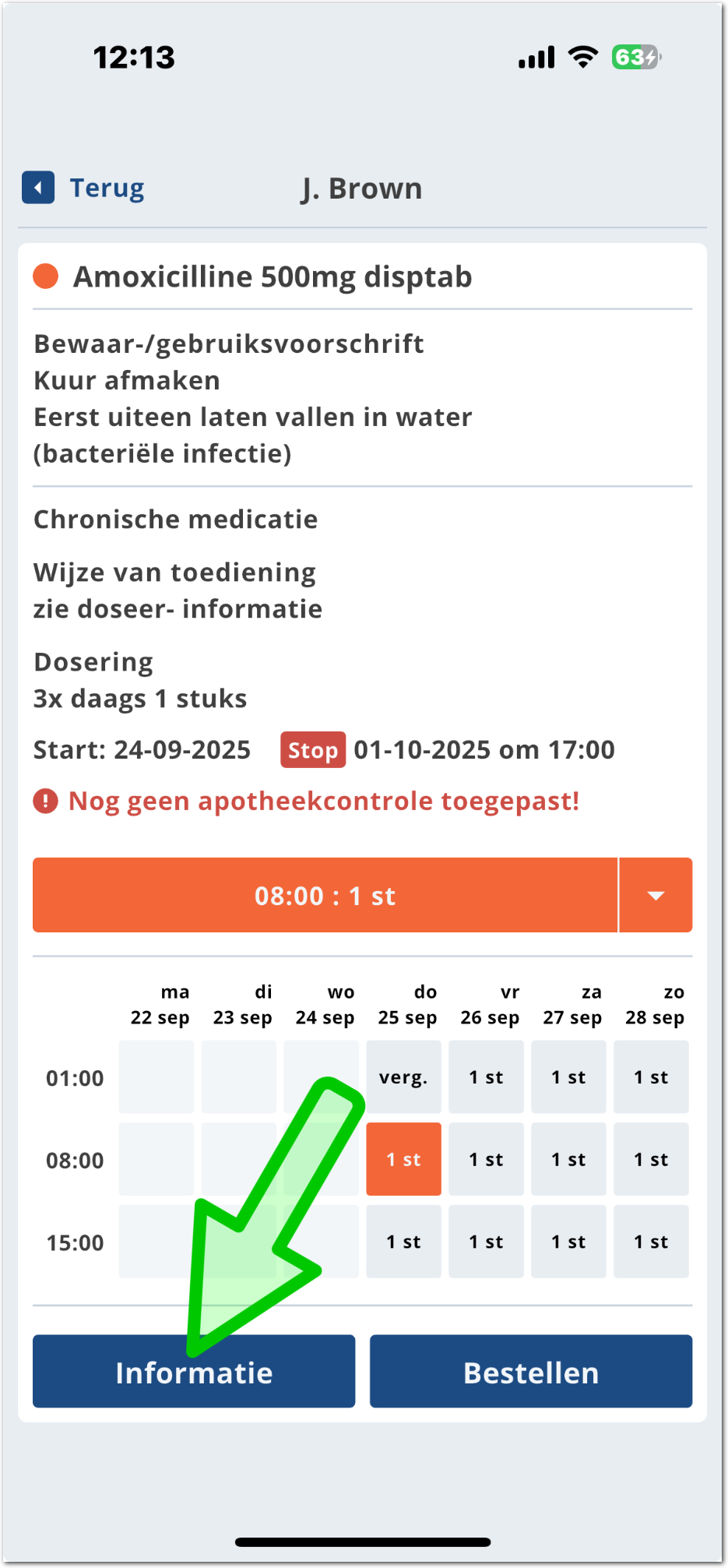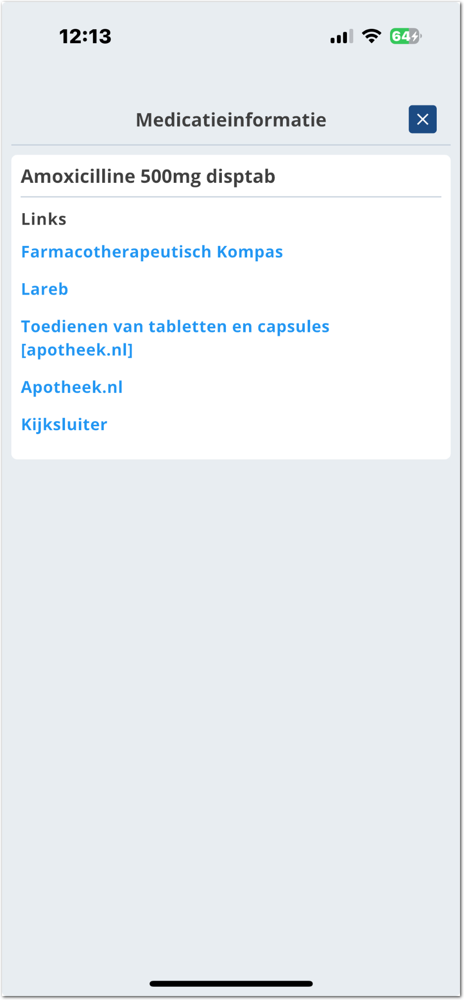 In de MedimoApp kunt u de Medicatieinformatie nagaan. Dit is een overzicht van verschillende informatiebronnen zoals Apotheek.nl en het Farmacotherapeutisch Kompas. In het overzicht van de medicatie wordt de knop Informatie getoond. Hiermee opent u de Medicatieinformatie van het geneesmiddel.