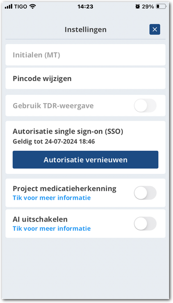 Hier wordt getoond tot wanneer de huidige autorisatie geldig is. Na dit moment vraagt de app automatisch om de autorisatie te vernieuwen. Na het tikken op de knop wordt de inlogpagina van uw zorgorganisatie getoond. U kunt inloggen met uw account en daarmee de autorisatie vernieuwen in de app.