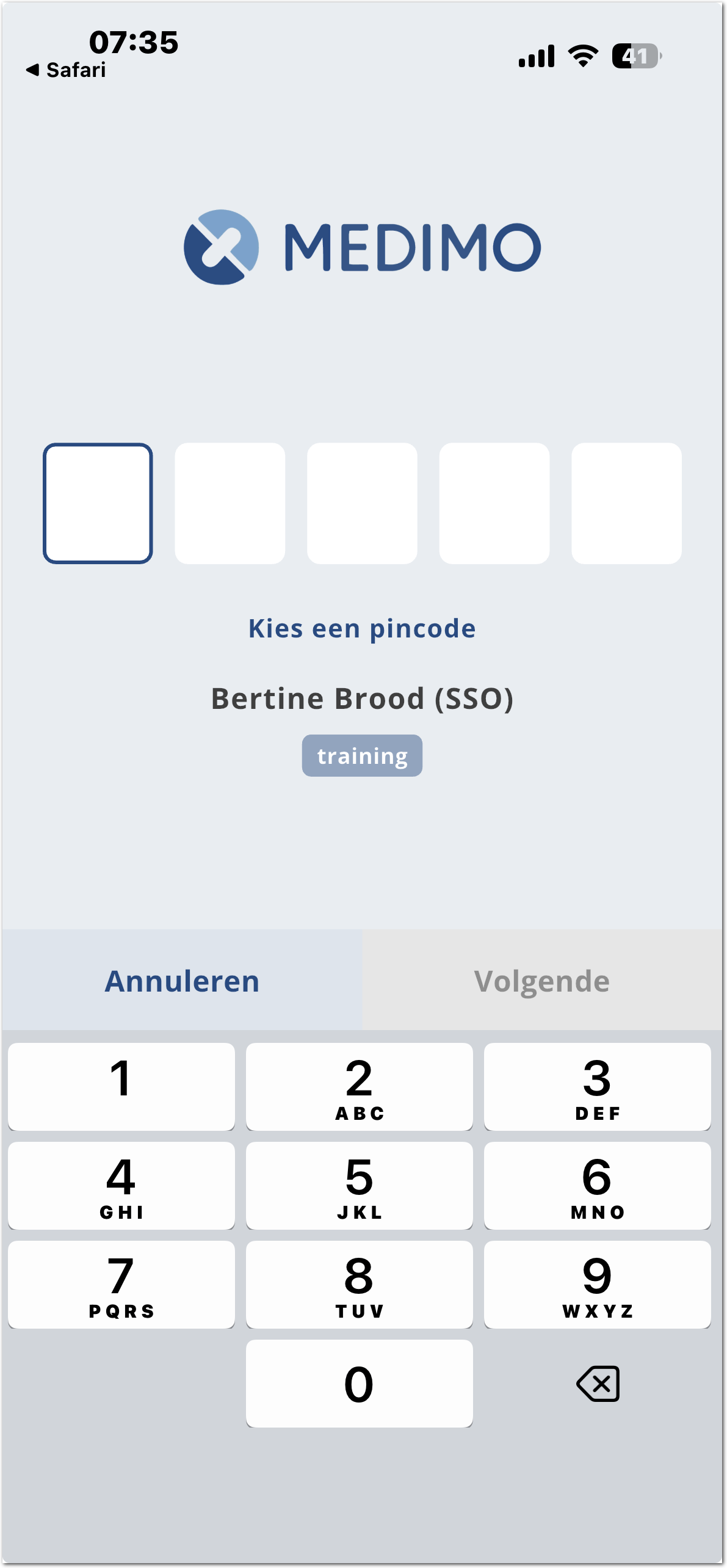 Hiermee opent u de MedimoApp. Uw apparaat kan vragen het openen van de app te bevestigen. Als de app eenmaal is geopend, wordt gevraagd een pincode te kiezen.