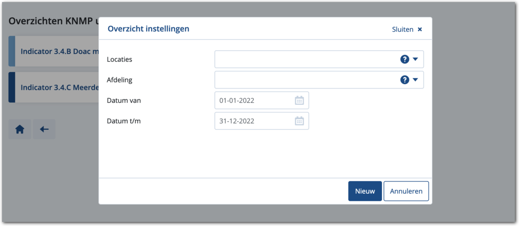 Doorgaans wilt u een dergelijk overzicht per cluster maken. U kunt in dat geval de velden voor 'Locaties' en 'Afdelingen' leeg laten.