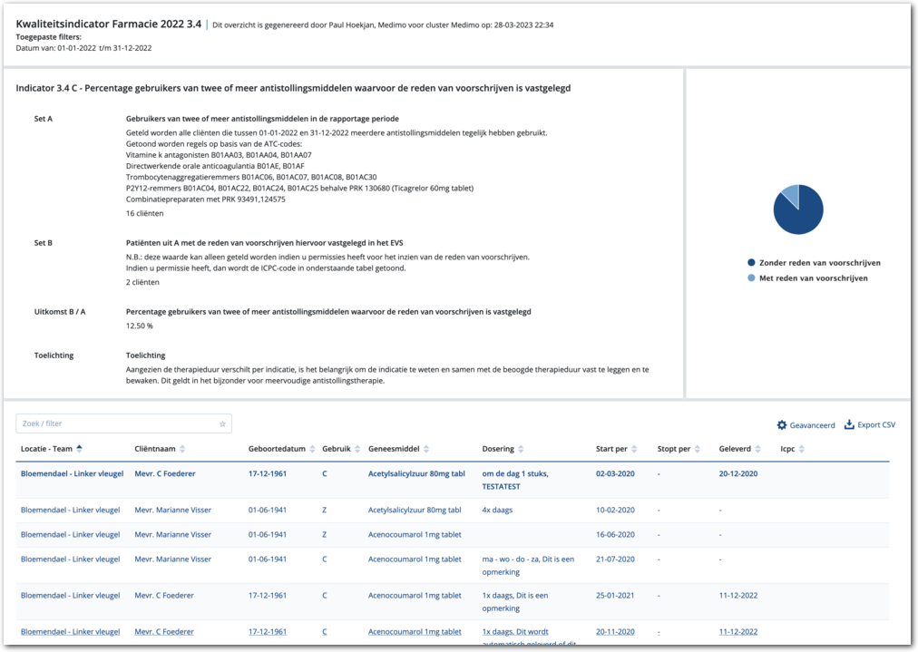 In het laatste blok worden de resultaten getoond. Elke regel stelt een voorgeschreven medicatieregel voor die voldoet aan de voorwaarden. U kunt filters toepassen en de data exporteren naar een CSV-bestand. Voor meer informatie daarover kunt u het onderdeel