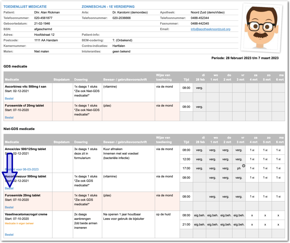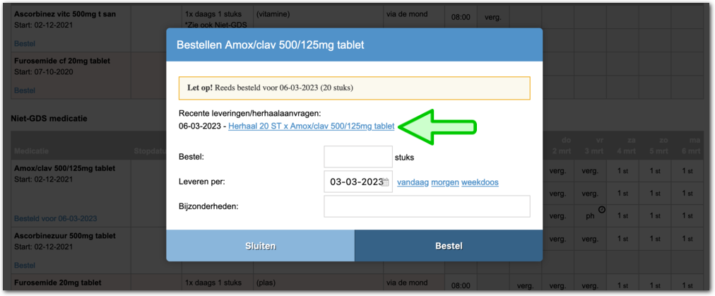 Ja, mits u in het bezit bent van de permissie 'Bestel herhaal medicatie'. U kunt u dat geval met de link 'Bestel' een bestelling plaatsen. Onderstaande afbeelding is een voorbeeld van een toedienregistratie van een cliënt. De blauwe pijl wijst hierin naar de betreffende link. Volg de onderstaande instructies om een bestelling te plaatsen.