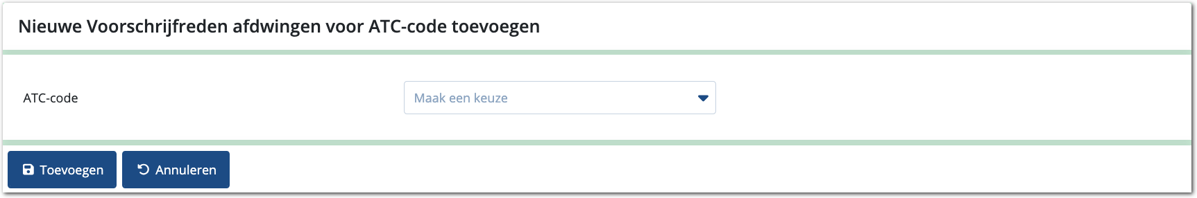 In deze lijst wordt onderaan Nieuwe toevoegen getoond. Hiermee start u het toevoegen van de ATC-code. Dit doet u in een scherm waarvan de afbeelding hieronder een voorbeeld van toont.