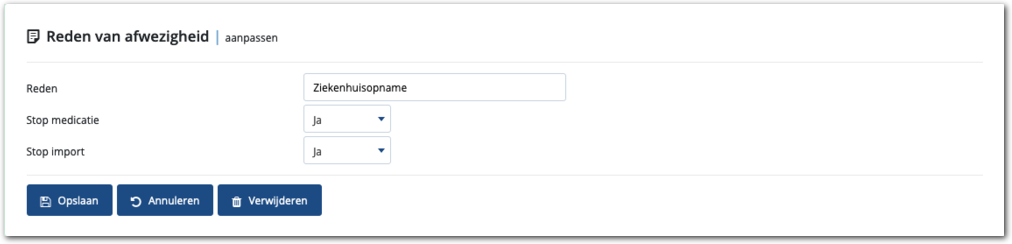 Aan de waarde bij het veld 'Reden' is de reden te herkennen. Voorbeelden van redenen zijn onder andere vakantie of weekendverlof. Bij het veld 'Stop medicatie' geeft u aan of bij terugkomst de medicatie van de cliënt moet worden gestopt. Medimo maakt an de gestopte medicatie, medicatievoorstellen die een voorschrijver kan accorderen. Stop import, geeft aan of de importkopppeling moet worden gedeactiveerd bij terugkomst. Meer daarover verderop in dit artikel.