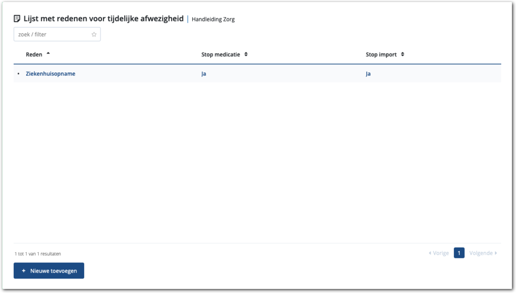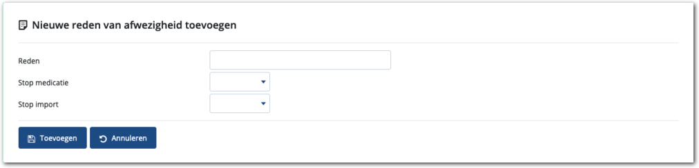 Hiermee voegt u de reden toe en toont Medimo de lijst met redenen voor tijdelijke afwezigheden.