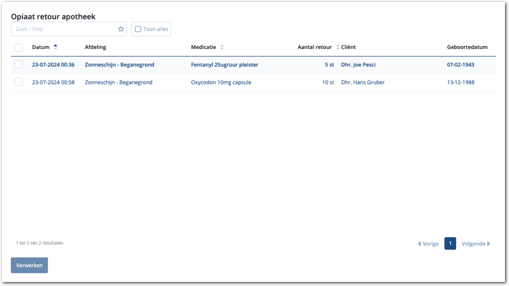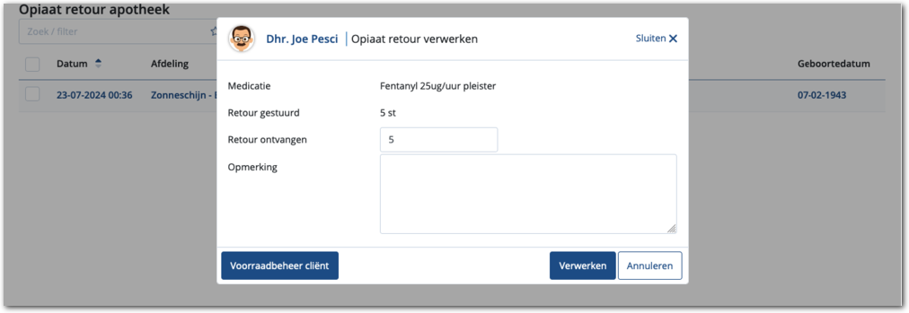Vanuit hier kunt u de binnengekomen retourzendingen selecteren en met de knop verwerken administreren dat de opiaten zijn ontvangen. Dit wordt vastgelegd in de voorraadhistorie van de cliënt.