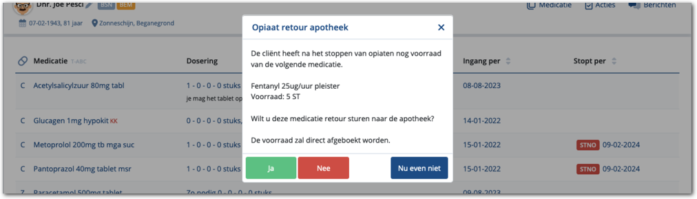 In de pop-up wordt weergegeven van welke medicatie er nog voorraad is en hoeveel. Er wordt gevraagd of u deze retour wilt sturen naar de apotheek. Kiest u ja, dan wordt de voorraad direct afgeboekt, wordt er een aanmelding gedaan dat de medicatie retour komt naar de apotheek en heeft u de actie daarmee afgehandeld.