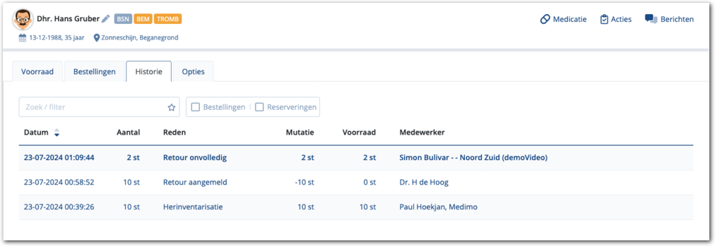 In bovenstaand voorbeeld heeft medewerker Dr. H de Hoog de actie afgehandeld en daarmee een retourzending van 10 stuks aangemeld. Hierdoor worden er 10 stuks afgeboekt (mutatie -10st) van de voorraad, is de voorraad vanaf dat moment 0 stuks.