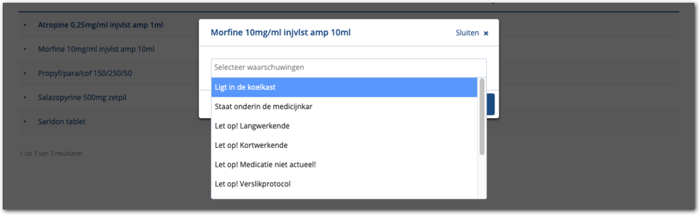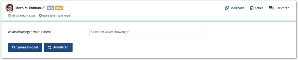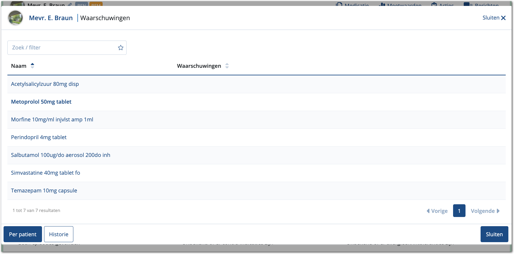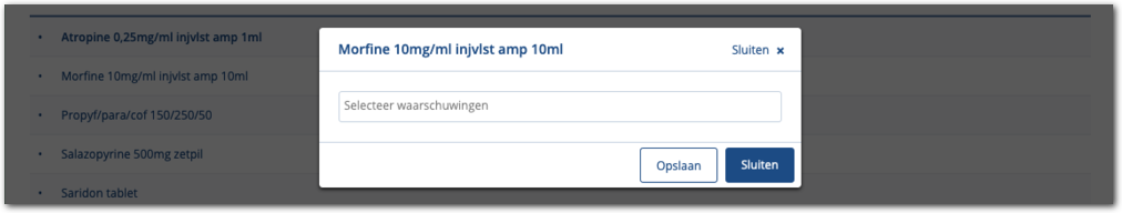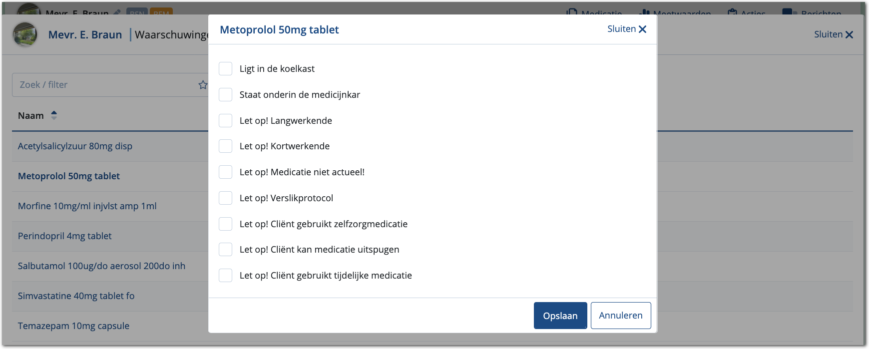 Waarschuwingen voegt u toe vanuit de status van de cliënt. Daar kunt u via het submenu van de knop Toedienregistratie de optie Waarschuwingen kiezen. Hiermee opent u de waarschuwingen in een pop-up. De afbeelding hieronder toont daarvan een voorbeeld.
