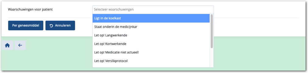 Waarschuwingen zijn te koppelen aan geneesmiddelen of aan de cliënt. Wilt u een waarschuwing koppelen aan een geneesmiddel? Kies dan op het geneesmiddel. Wilt u een waarschuwing koppelen aan de cliënt klik dan op de knop Per cliënt. In beide gevallen wordt een lijst van de te koppelen waarschuwingen weergegeven. In de afbeelding hieronder ziet u daarvan een voorbeeld.