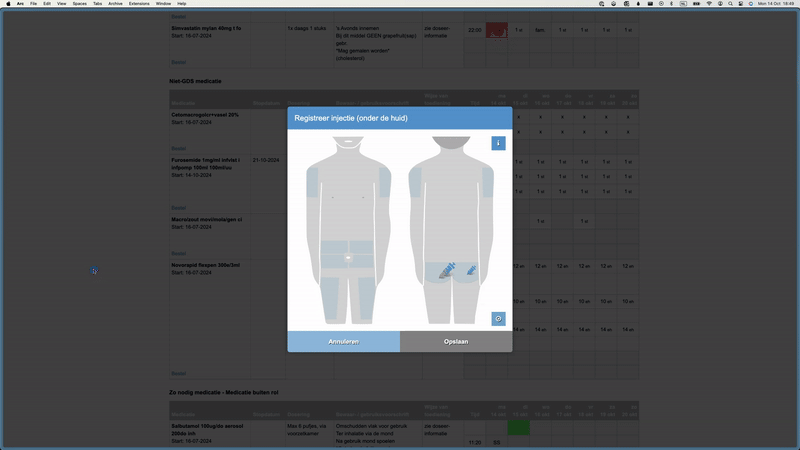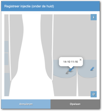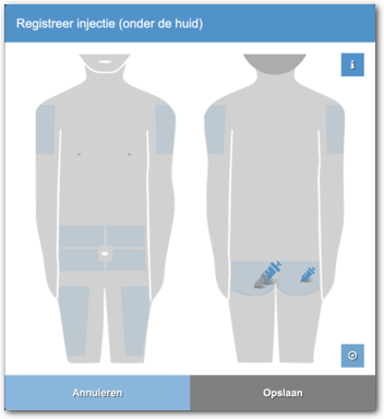 Hier zie je aan de injecties wat de voorgaande plaatsen van toediening waren en kunt u aangeven waar u de injectie hebt gezet.