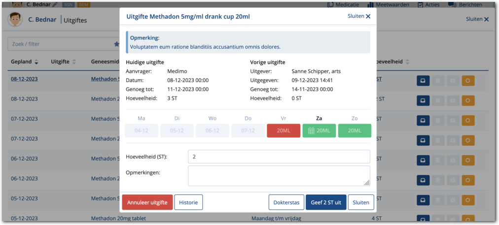 toont Medimo de knoppen en velden om de uitgifte te registreren.