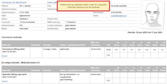 hoeven te worden. Pas bij klikken op de pasfoto wordt de toedienlijst van de