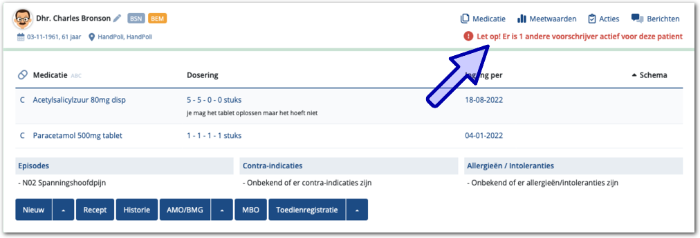 In deze versie wordt een functie toegevoegd om gebruikers te attenderen dat een (andere) voorschrijver actief is voor dezelfde cliënt. Dat kan handig zijn voor een zorgmedewerker die naar een medicatiestatus kijkt dat mogelijk de medicatie binnenkort zal wijzigen. Of voor een apotheekmedewerker die medicatieopdrachten aan het autoriseren is, dat er mogelijk nog meer wijzigingen onderweg zijn. Onderstaande afbeelding is een voorbeeld van de status van een cliënt
