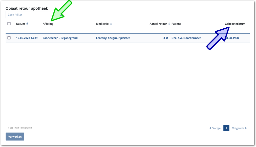 In een vorige versie is een mogelijkheid toegevoegd voor het retour boeken van de opiaten. Vanaf deze versie worden er extra kolommen toegevoegd aan de schermen. De naam van de afdeling wordt toegevoegd om makkelijk na te kunnen gaan van welke afdeling het middel retour zou moeten komen. Tevens wordt de geboortedatum van de cliënt toegevoegd om de cliënt makkelijker in het apotheeksysteem te kunnen opzoeken. Onderstaande afbeelding is een voorbeeld van deze nieuwe weergave. Hierbij wijzen de gekleurde pijlen naar de extra toegevoegde kolommen.
