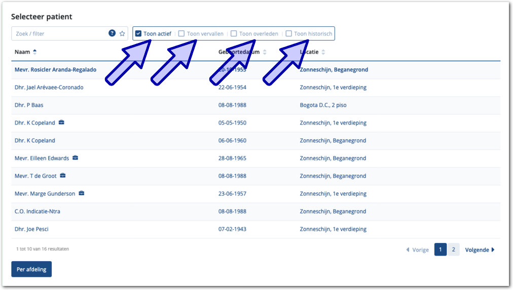 Het zoeken van een cliënt is gemoderniseerd. Daarbij is de functionaliteit gelijk gebleven, maar onder water is de techniek vernieuwd. In plaats van blauwe knoppen onderin zijn nu quickfilters bovenin geplaatst, vergelijkbaar met andere schermen in Medimo. Onderstaande afbeelding is een voorbeeld van het zoeken naar cliënten via de knop 'Status'. De blauwe pijlen wijzen naar de quickfilters.