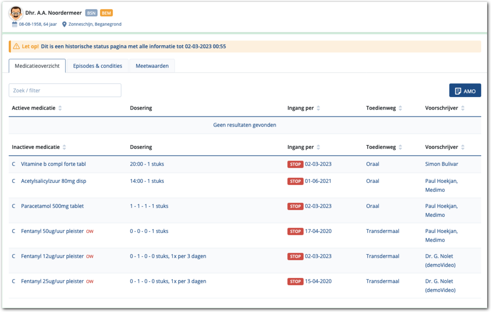 Getoond worden de tot dan toe nog lopende medicatieregels, alsook de gestopte medicatieregels. In een ander tabblad worden de intoleranties/allergieën en contraindicaties getoond. In een derde tabblad worden meetwaarden getoond, ook weer tót het laatste moment dat de gebruiker gerechtigd was.