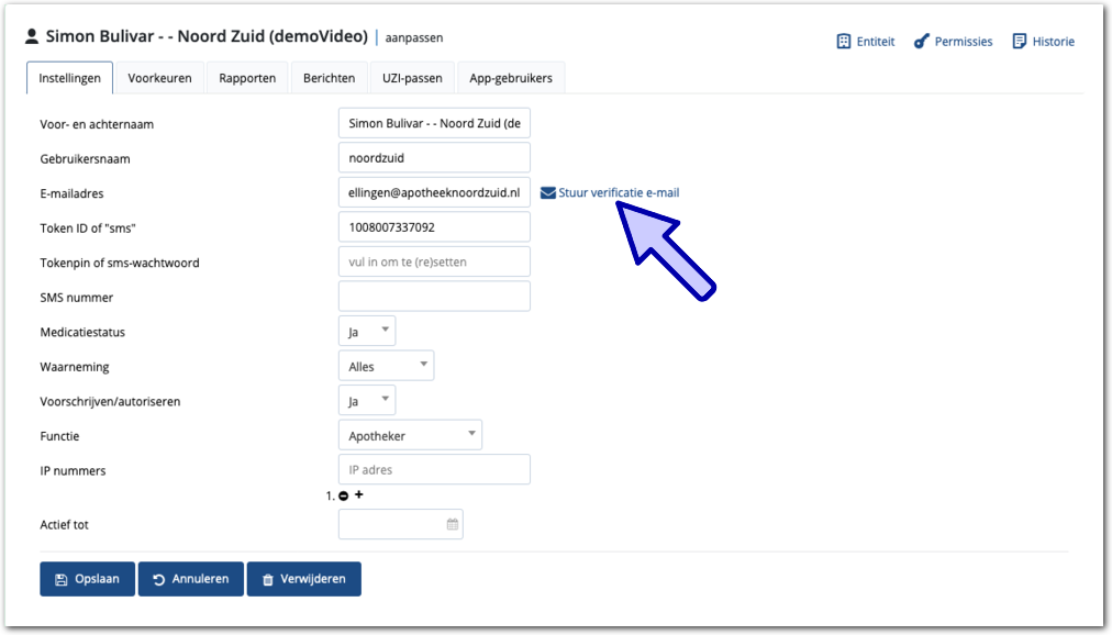 Het emailadres van gebruikers wordt onder andere gebruikt voor een koppeling naar het Medimo-Helpcentrum. Om deze koppeling ook voor niet-applicatiebeheerders mogelijk te maken, is het van belang het emailadres van de gebruikers te kunnen verifiëren. Vanaf deze versie kan er vanuit het accountoverzicht van de gebruikers achter het emailadres op de knop 'Verifieer e-mailadres' geklikt worden. Onderstaande afbeelding is een voorbeeld van het accountoverzicht van een gebruiker. De blauwe pijl wijst naar de link om het e-mailadres te verifiëren.