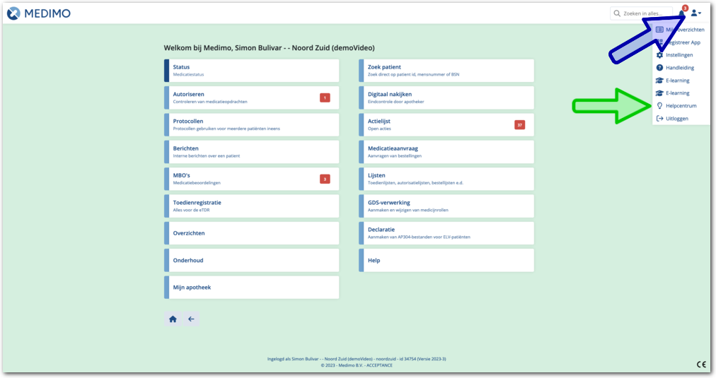 De links naar de oude pagina's in Medimo voor documentatie en frequently asked questions worden verwijderd. Deze zijn te vinden op portaal.medimo.nl en ook via de link 'Helpcentrum' in het menu rechtsboven. Onderstaande afbeelding is een voorbeeld van het hoofdmenu. De blauwe pijl wijst naar het icoon om het menu rechtsboven te openen. De groene pijl wijst naar de link voor het 'Helpcentrum'.