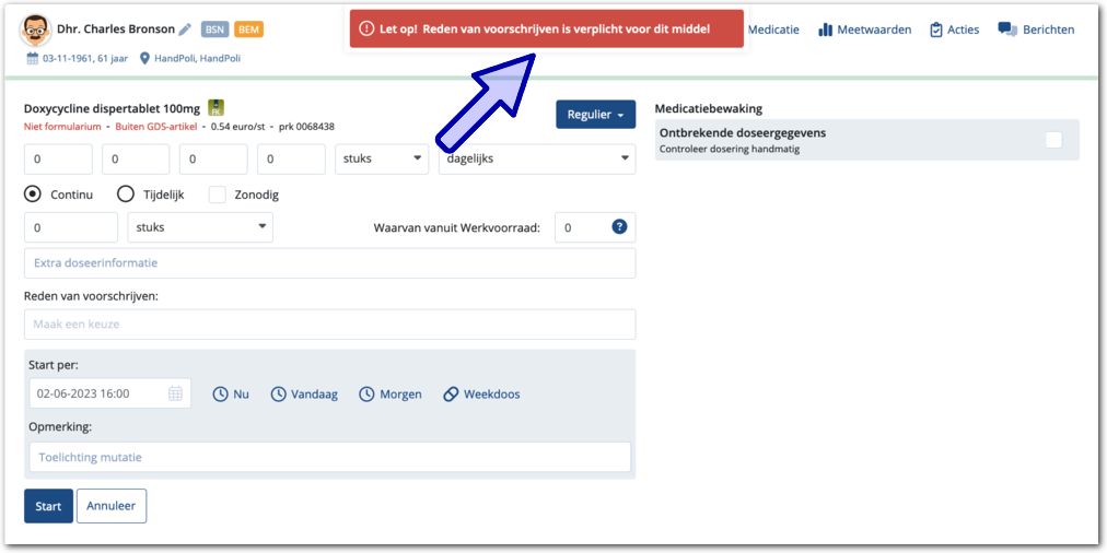 Applicatiebeheerders kunnen deze categorieën vastleggen bij Beheer > Clustertabellen. Daarbij kan per ATC-code worden aangegeven of reden van voorschrijven verplicht is. Medimo waarschuwt de voorschrijver als er geen reden is opgegeven en blokkeert de start totdat de voorschrijver een reden heeft opgegeven. Onderstaande afbeelding is een voorbeeld van een dergelijke blokkade tijdens het voorschrijven.