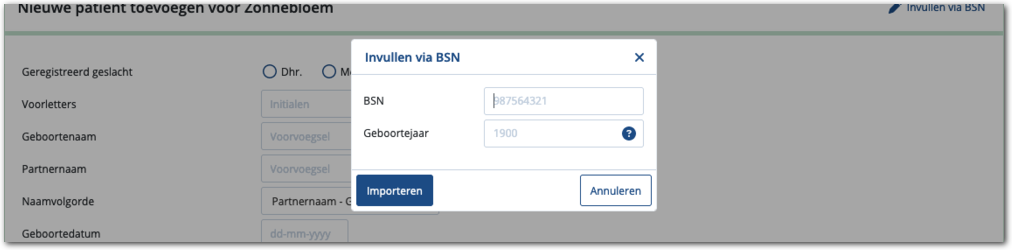 Met deze link opent u een pop-up waar u met de BSN en geboortejaar de gegevens van de cliënt kan importeren. Dit komt overeen met de onderstaande afbeelding.