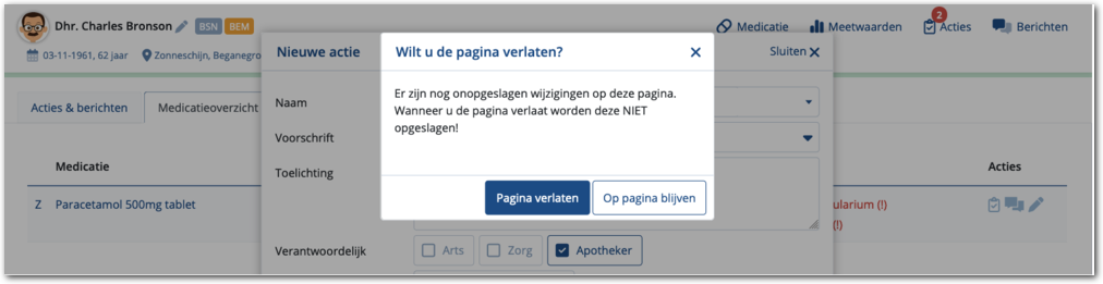 Ook wordt bij het verlaten van de pagina, terwijl er nog een pop-up geopend is, gevraagd om bevestiging. De onderstaande afbeelding is hiervan een voorbeeld.