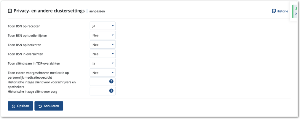 In versie 2023-3 is een archiefinzage geïntroduceerd, zodat een cliënt nog steeds opgezocht kan worden, zelfs wanneer deze inmiddels op een andere afdeling of onderdeel binnen de zorgorganisatie zorg ontvangt. De informatie die daarbij wordt getoond, is beperkt tot de gegevens die bekend waren tot het moment van ontslag van de locatie waar de gebruiker rechten heeft. Mogelijk hanteert de zorgorganisatie hier wel bepaalde beleidsregels. Vanaf deze versie is het mogelijk om voor zorgmedewerkers, apotheekgebruikers en artsen een limietperiode in te stellen. Dit kan worden ingesteld via Beheer > Clustertabellen > Privacy- en andere clustersettings. Hier ziet u een scherm dat overeenkomt met de onderstaande afbeelding.
