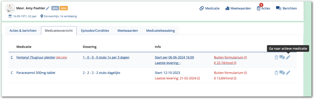 Vanuit de MBO is het nu mogelijk om direct te navigeren naar de betreffende medicatieregel van de cliënt om deze direct aan te passen. Hiervoor gebruikt u het potloodicoon dat aan de rechterzijde wordt weergegeven. De onderstaande afbeelding is een voorbeeld van het medicatieoverzicht in de MBO.