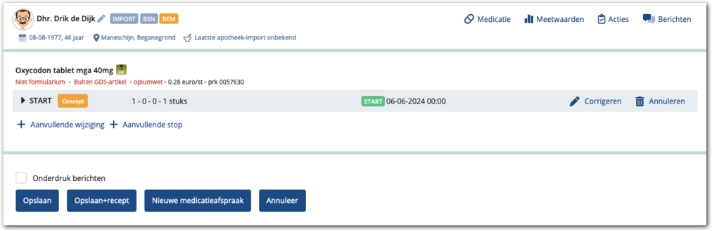 Om dit proces voor de voorschrijver te vergemakkelijken, wordt vanaf deze versie bij niet-klinische locaties, in het bevestig-scherm naast de knop 'Opslaan', de knop 'Opslaan+recept' weergegeven.