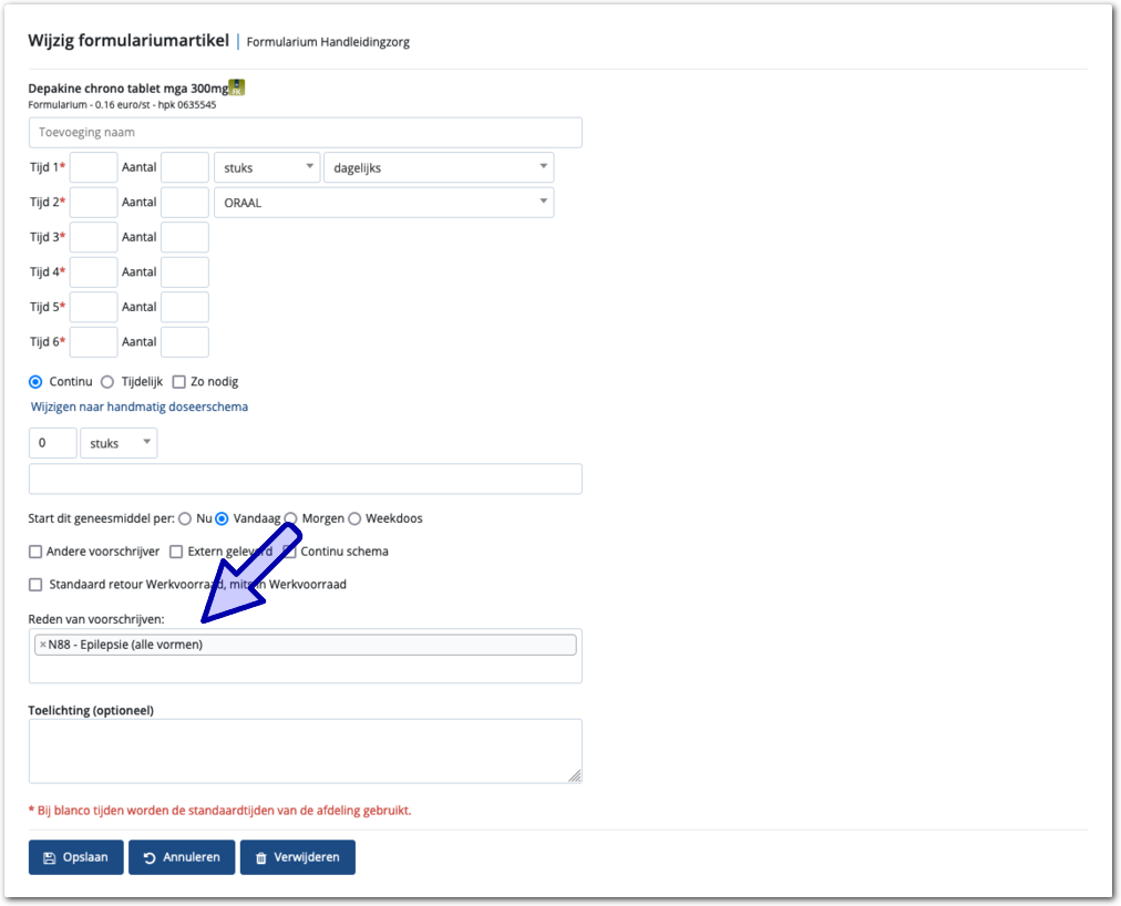 In bovenstaande voorbeeld wordt bij het voorschrijven van 'Depakine chrono tablet mga 300mg' de reden 'N88 - Epilespsie (alle vormen)' automatisch ingevuld.