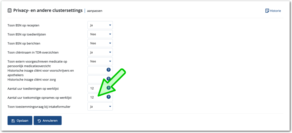 - Aantal uur toekomstige opnames op de werklijst: Wanneer een cliënt binnenkort naar uw afdeling/team wordt overgeplaatst, is deze cliënt (vanwege de overdracht) al zichtbaar voor uw afdeling/team. Standaard staat dit ook op 12 uur. Dit moet niet te ver in de toekomst zijn, omdat het anders verstorend kan zijn voor de rondes wanneer de cliënt nog niet is gearriveerd.