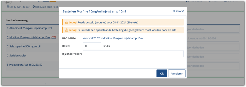 In een eerdere versie is het mogelijk geworden om het bestellen van opiumwetmedicatie te laten goedkeuren door de voorschrijver. Tijdens het bestellen wordt hierover een waarschuwing getoond. Vanaf deze versie wordt de waarschuwing aangepast als er al een eerdere aanvraag is ingediend die nog niet door de voorschrijver is goedgekeurd.